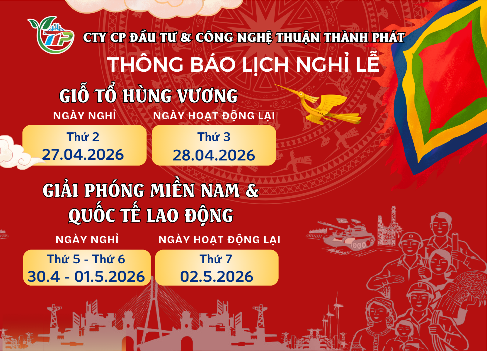 - Tháng Tư lịch sử và tháng Năm rộn ràng đang đến gần, mang theo chuỗi ngày nghỉ lễ ý nghĩa. Công ty CP Đầu tư và CN Thuận Thành Phát trân trọng thông báo lịch nghỉ lễ Giỗ Tổ Hùng Vương và nghỉ lễ 30/4 - 01/5 năm 2026 tới toàn thể CBCNV. Cụ thể: